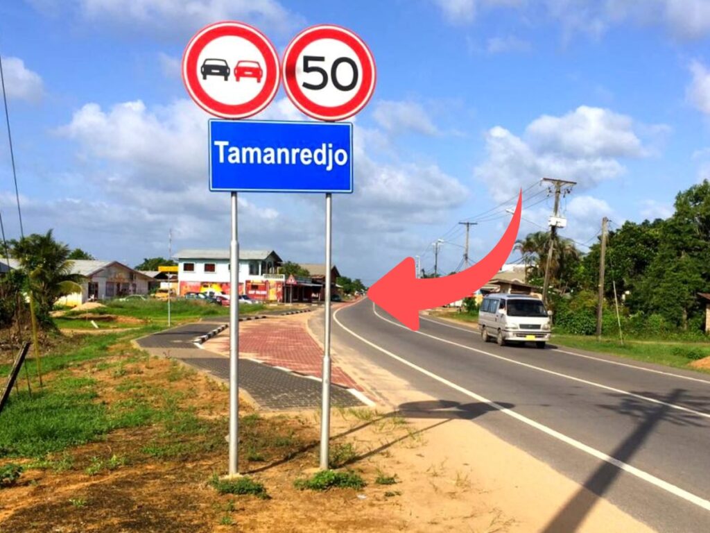 Kom je vanaf Paramaribo via de Oostwestverbinding? Sla dan linksaf bij de eerste afslag na het bord ‘Tamanredjo’. Op de foto zie je precies waar. De ingang van Sendang Redjo ligt op slechts 400 meter van de hoofdweg.